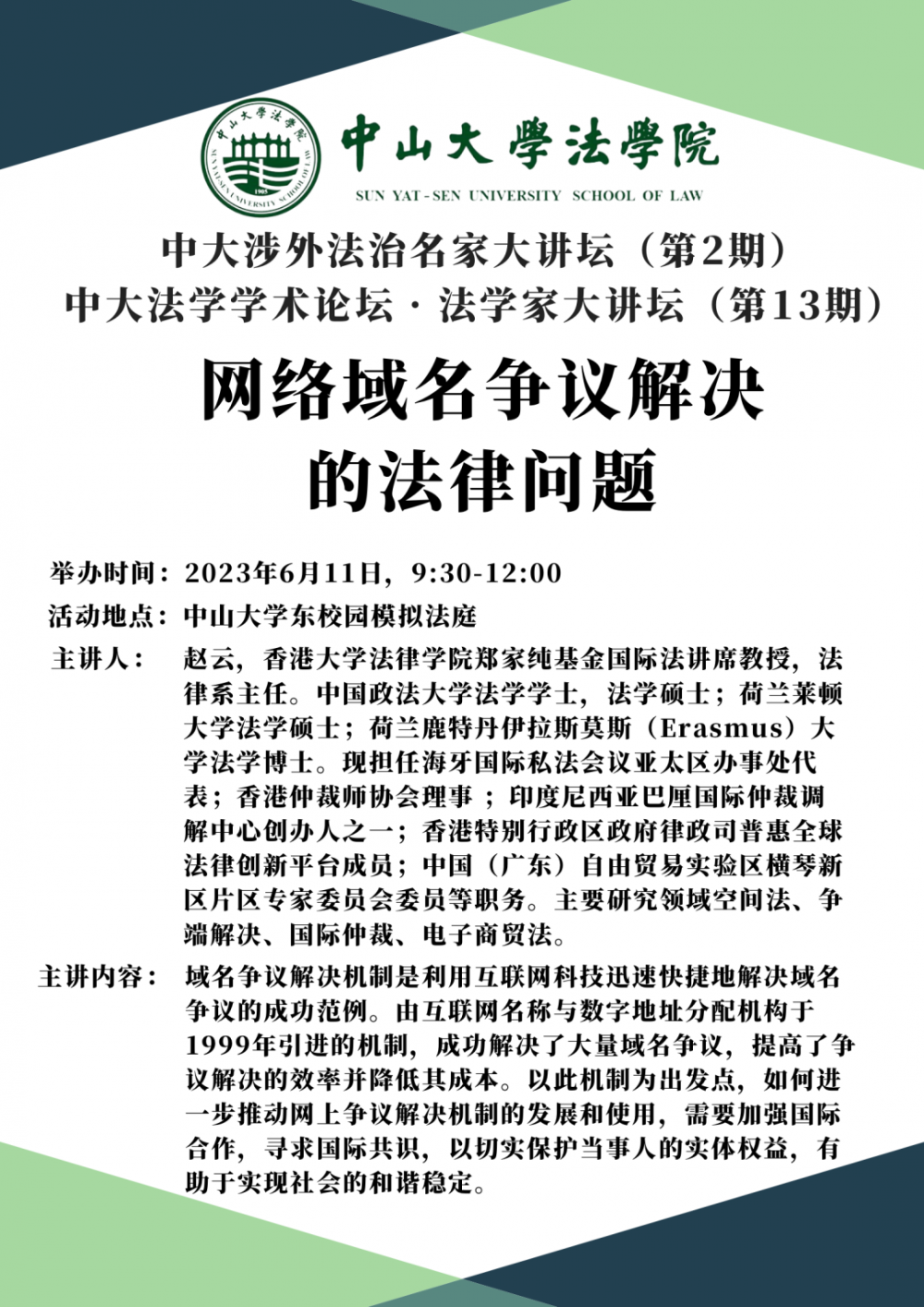 【学术论坛预告】 中大涉外法治名家大讲坛第2期 • 中大法学学术论坛 • 法学家大讲坛(第13期)——网络域名争议解决的法律问题