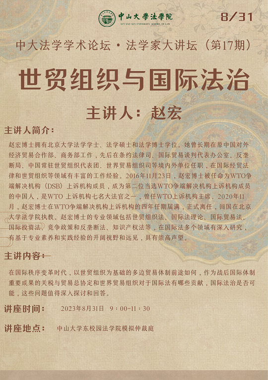 【学术论坛预告】 中大涉外法治名家大讲坛第3期 •中大法学学术论坛 • 法学家大讲坛(第17期)——世贸组织与国际法治
