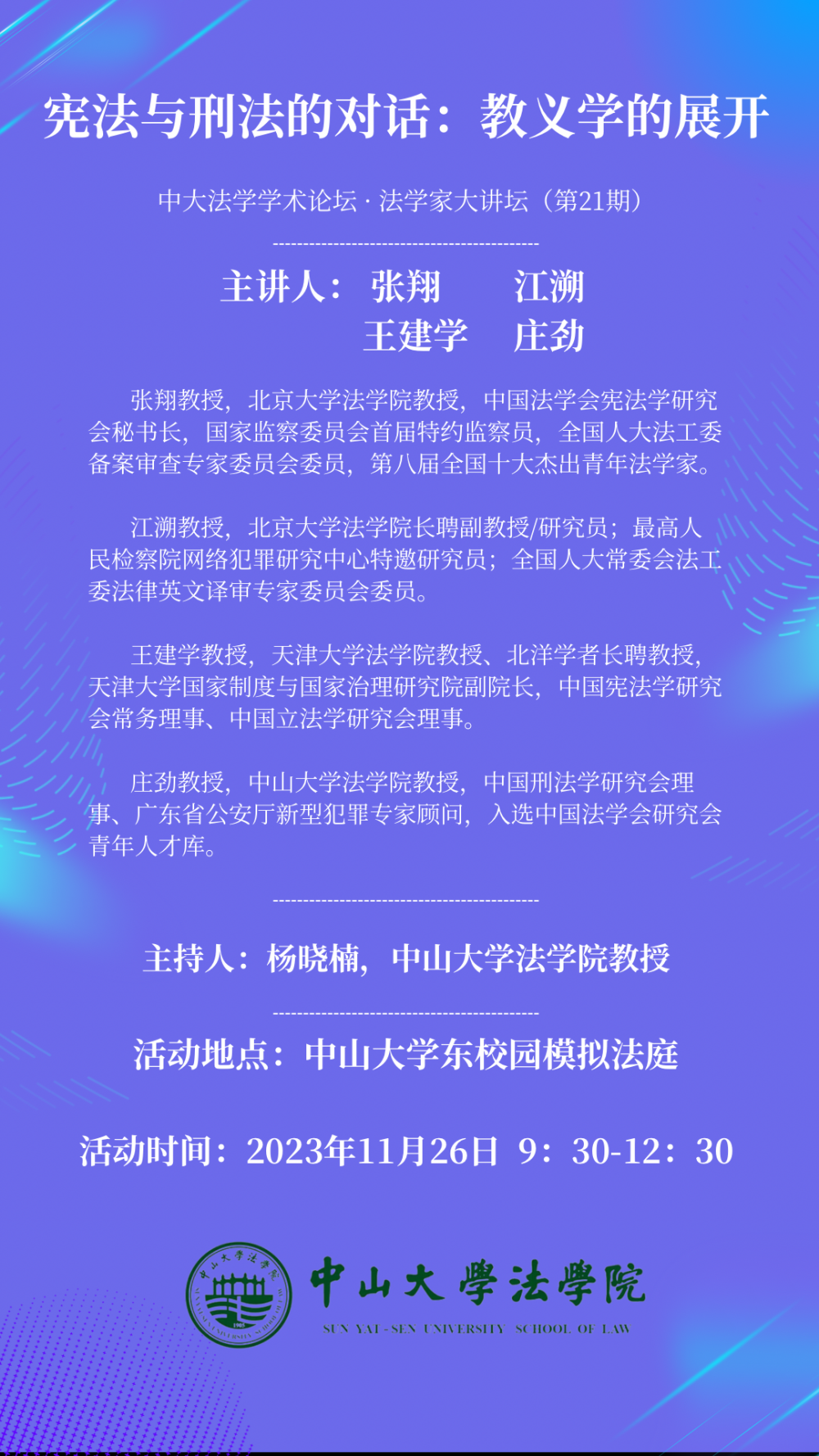 【学术论坛预告】中大法学学术论坛 • 法学家大讲坛(第 21 期) ——宪法与刑法的对话:教义学的展开