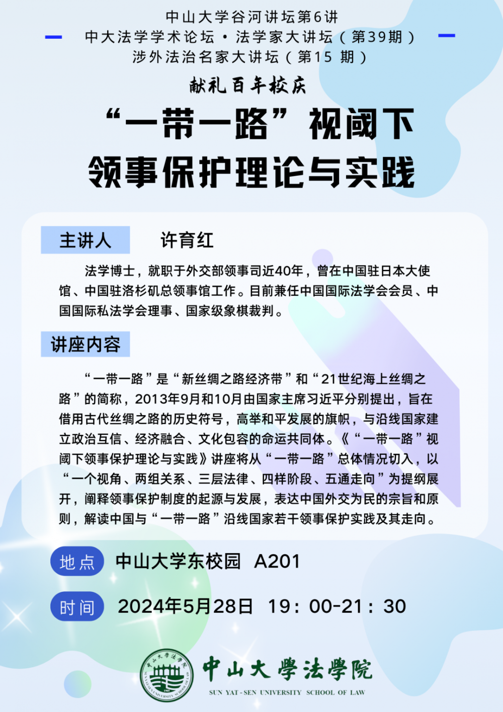 【学术论坛预告】304永利集团谷河讲坛第6讲、中大法学学术论坛•法学家大讲坛(第39期)、涉外法治名家大讲坛(第15期)—— “一带一路”视阈下领事保护理论与实践