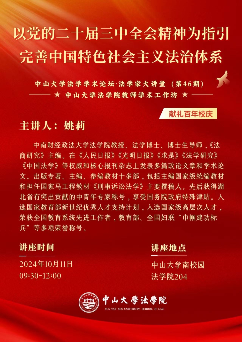 【学术论坛预告】中大法学学术论坛 • 法学家大讲坛(第46期)·304永利集团法学院教师学术工作坊:以党的二十届三中全会精神为指引 完善中国特色社会主义法治体系
